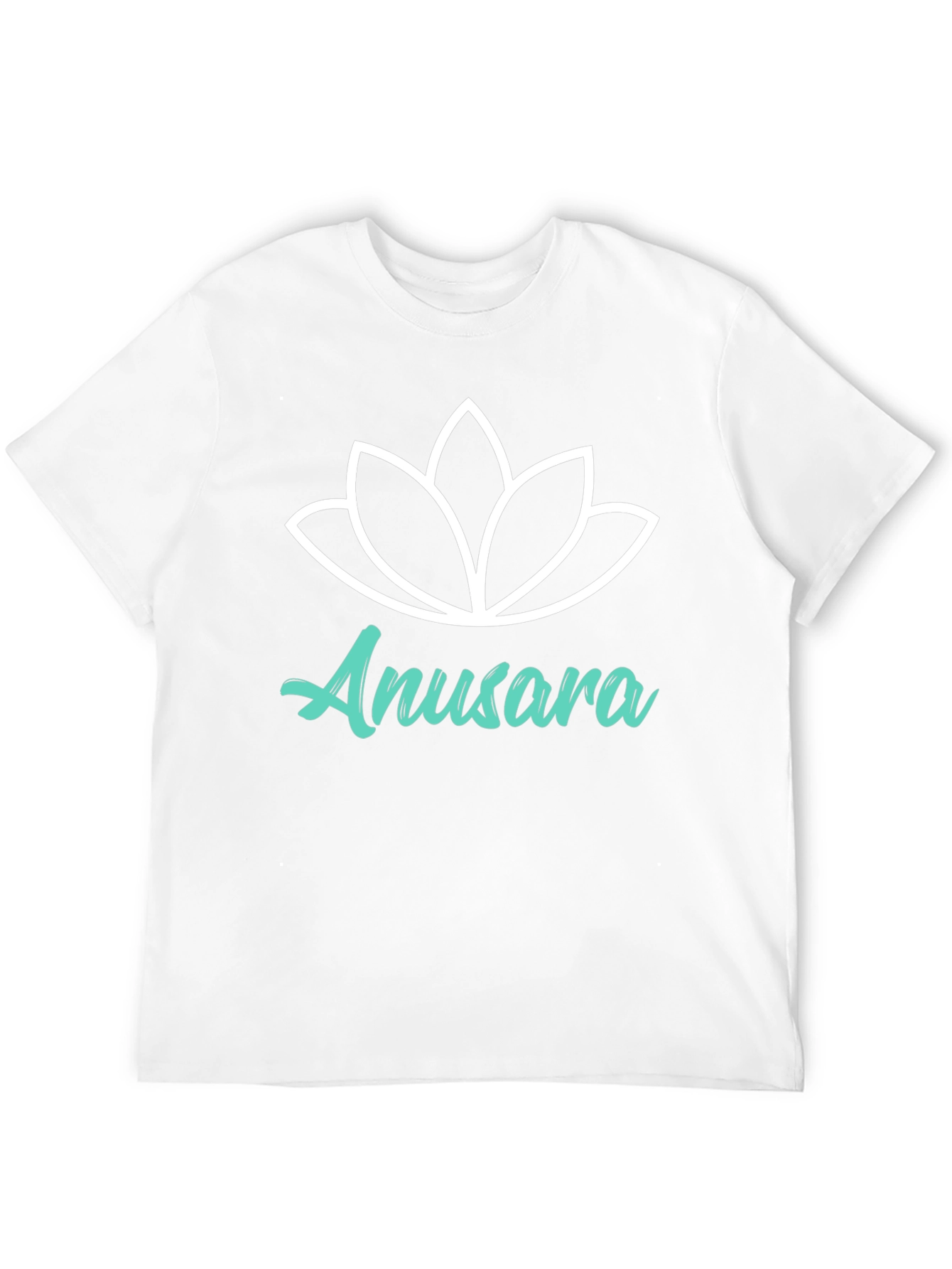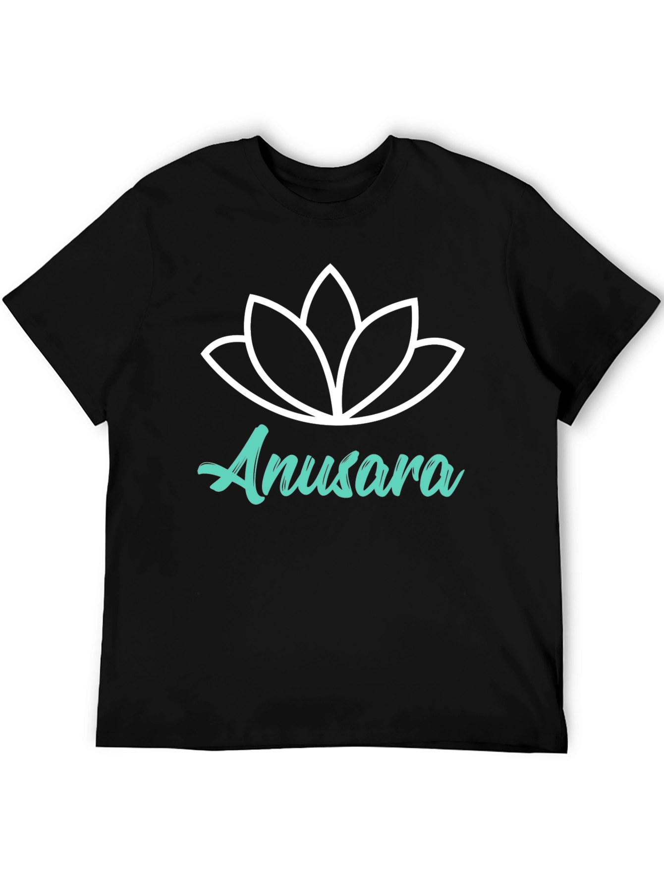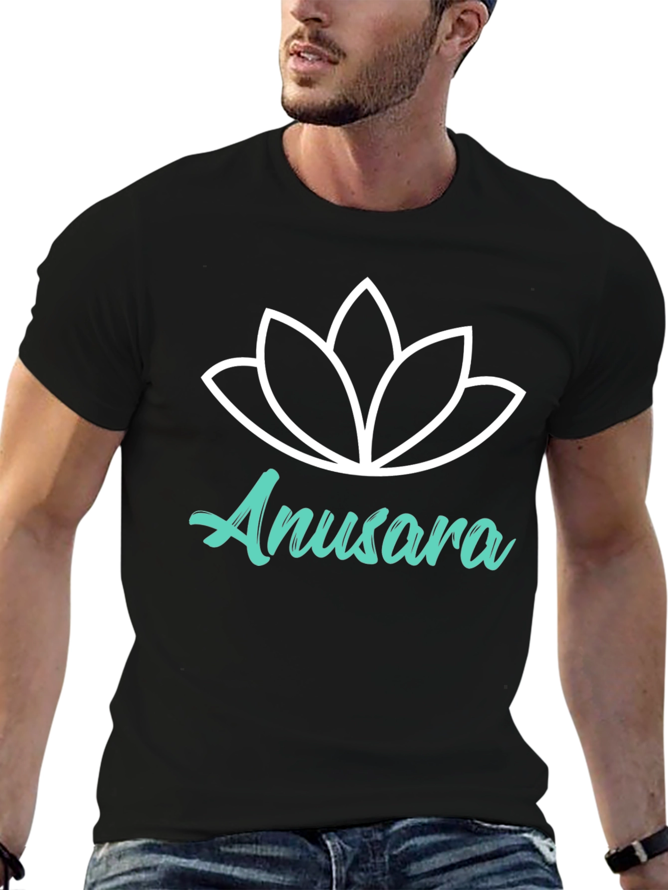 Embrace mindful living with this stylish black t-shirt featuring a serene yoga-inspired design. The shirt showcases a clean, white lotus flower graphic above the word "Anusara" in a tranquil turquoise script. The combination of the lotus and the script gives a sense of peace and style. Made from a comfortable-looking fabric, this tee is perfect for yoga enthusiasts, meditation practitioners, or anyone who appreciates a blend of comfort and spiritual fashion. Wear it to your next yoga class, casual outings, or while relaxing at home. This t-shirt is sure to bring a sense of calm to your wardrobe.