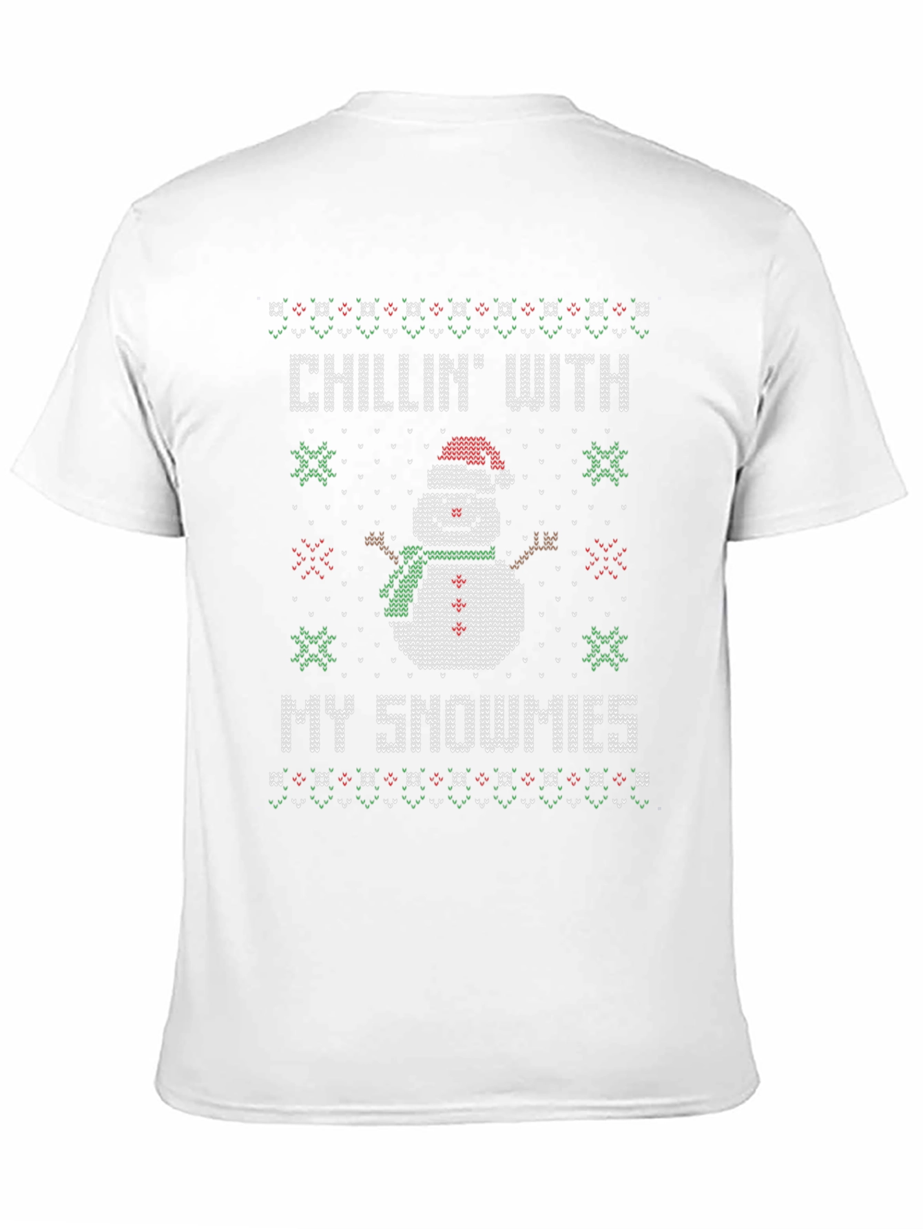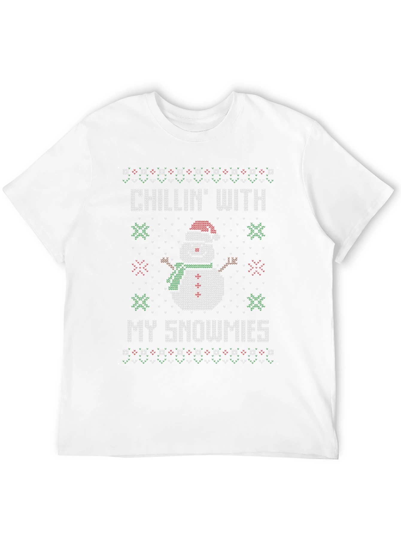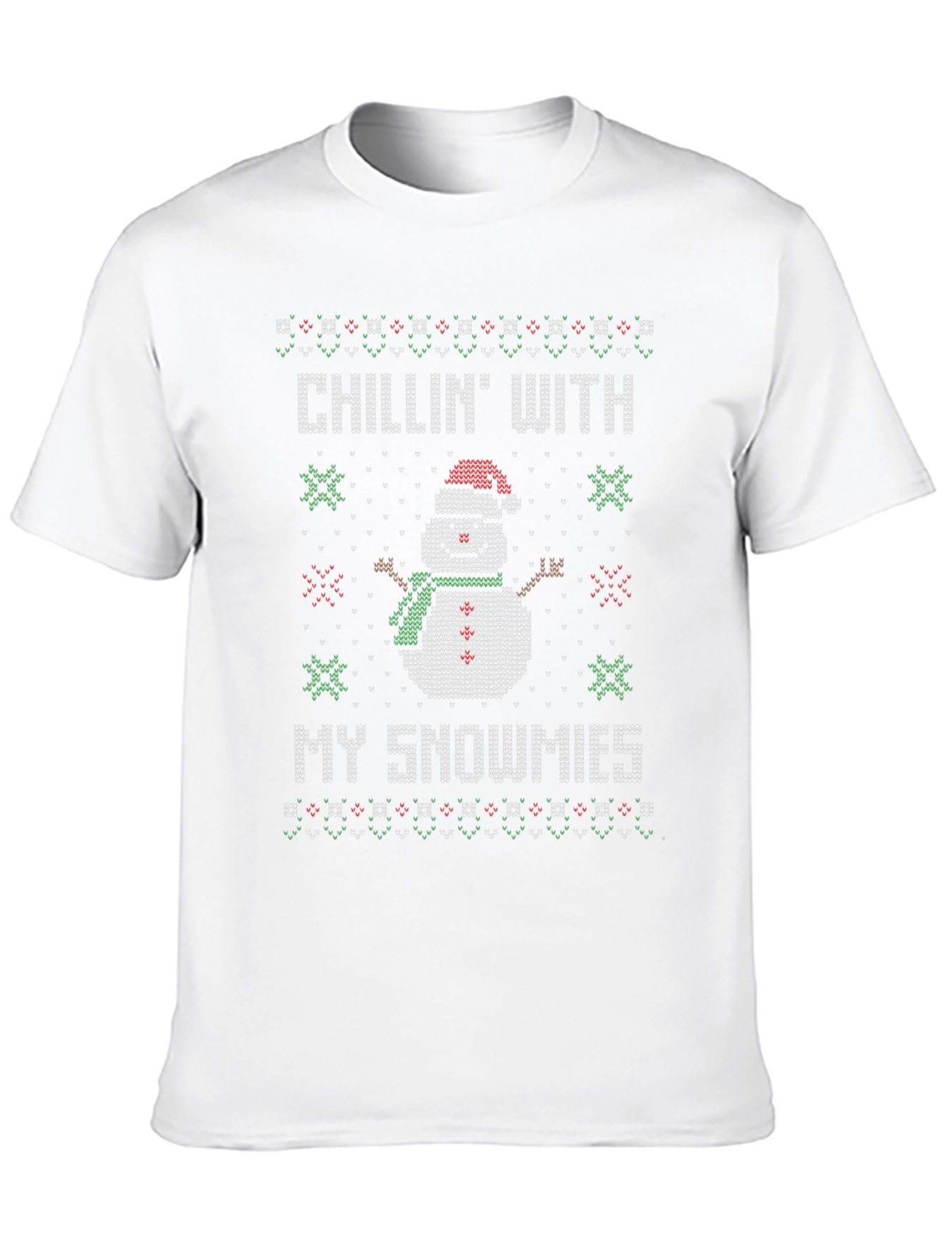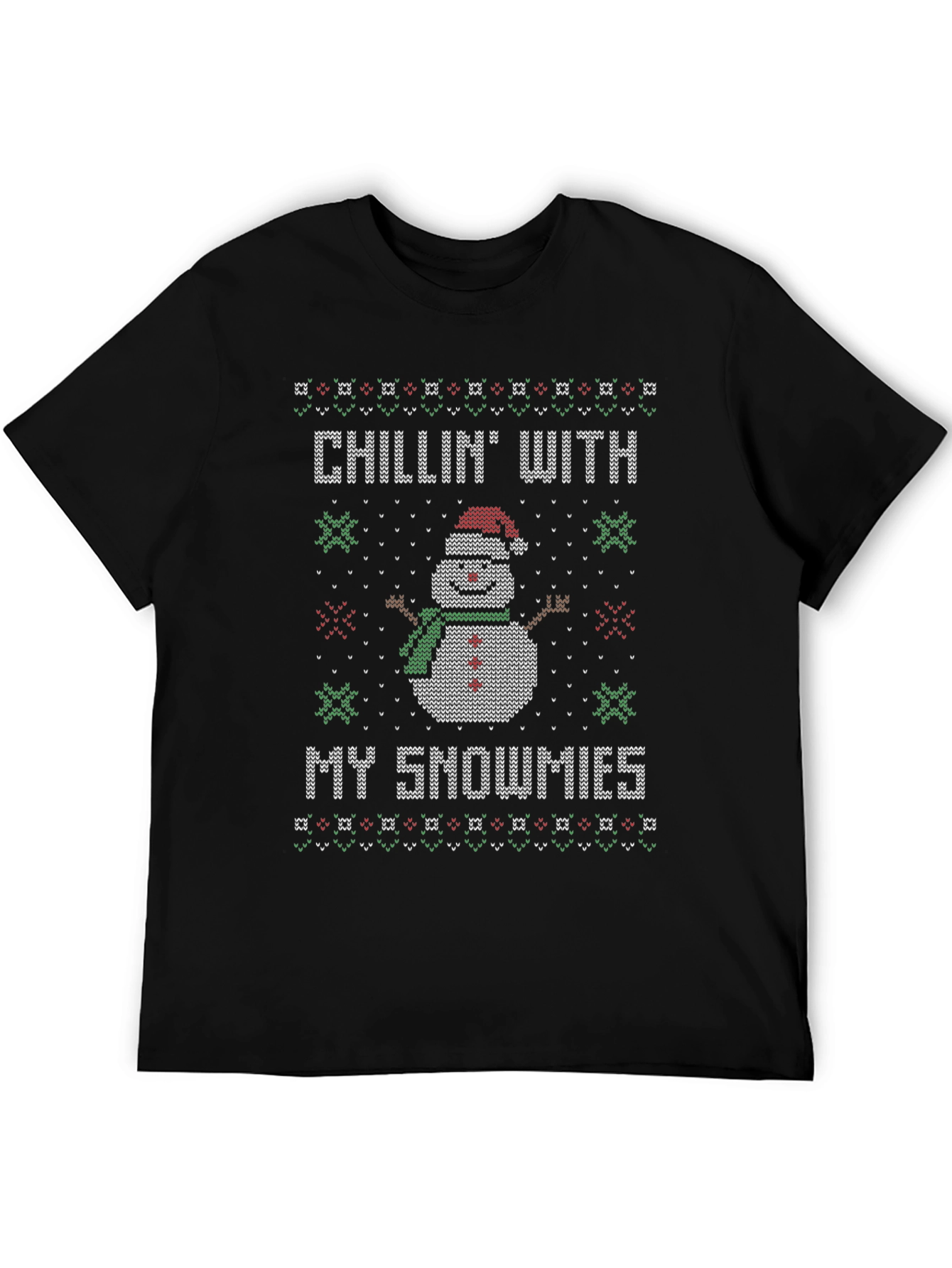 Get festive with this 'Chillin' With My Snowmies' T-shirt! This black, short-sleeved tee features a fun, knitted-style graphic of a smiling snowman wearing a Santa hat and green scarf. The snowman design is bordered by Christmas patterns. Perfect for holiday parties, casual wear, or spreading Christmas cheer wherever you go, this unique tee will be a conversation starter. A comfortable and stylish way to celebrate the season, it's sure to bring smiles and festive vibes to everyone you meet. Grab yours now and let the holiday fun begin!