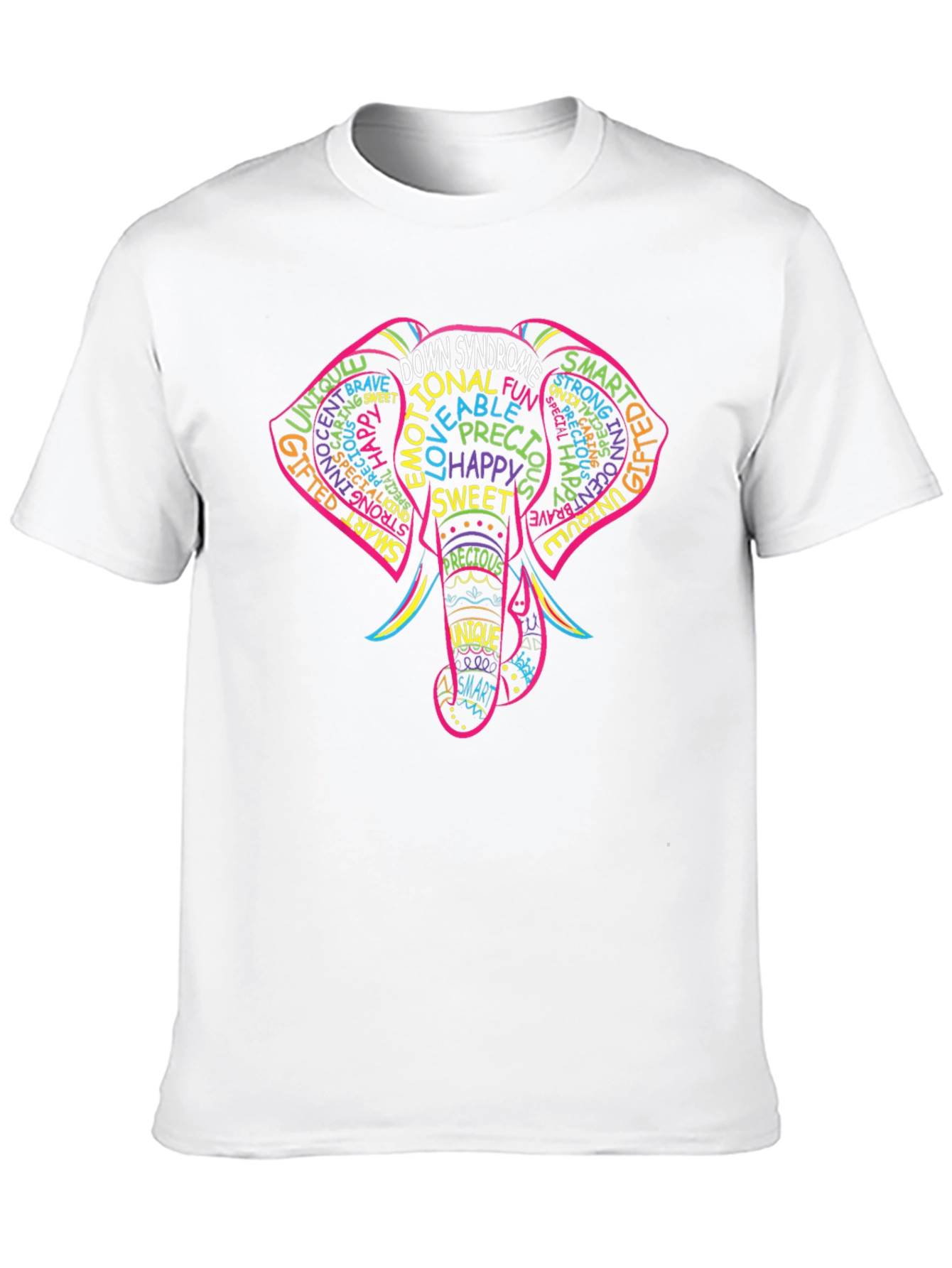 Show your support with this eye-catching black t-shirt featuring a vibrant, word-art elephant design. The elephant's silhouette is cleverly filled with positive words like "Happy", "Unique", "Smart", and "Precious", raising awareness for Down Syndrome. Made from a comfortable, breathable fabric, this tee is perfect for everyday wear. Ideal for Down Syndrome awareness events, casual outings, or simply to spread a message of love and acceptance. A meaningful and stylish way to show your support!