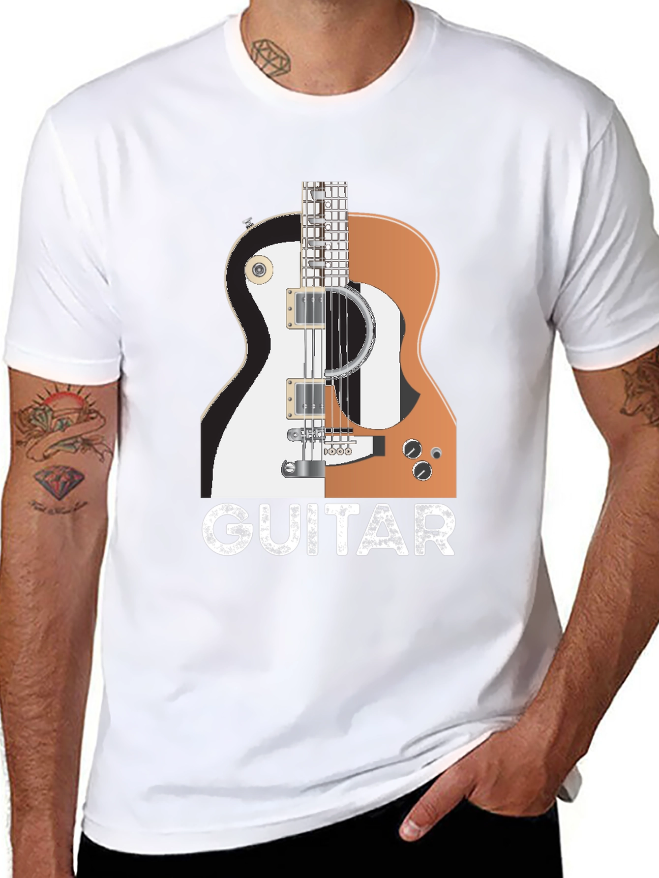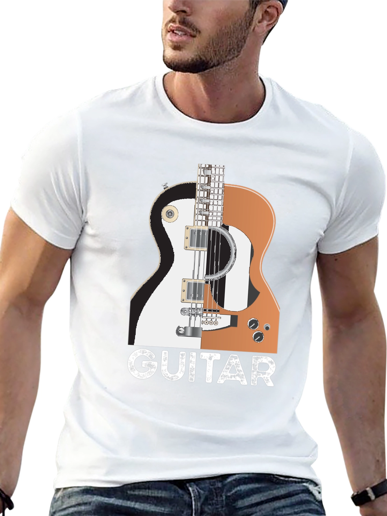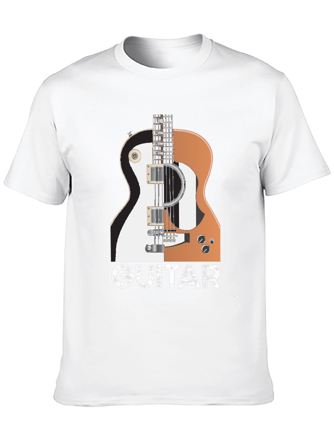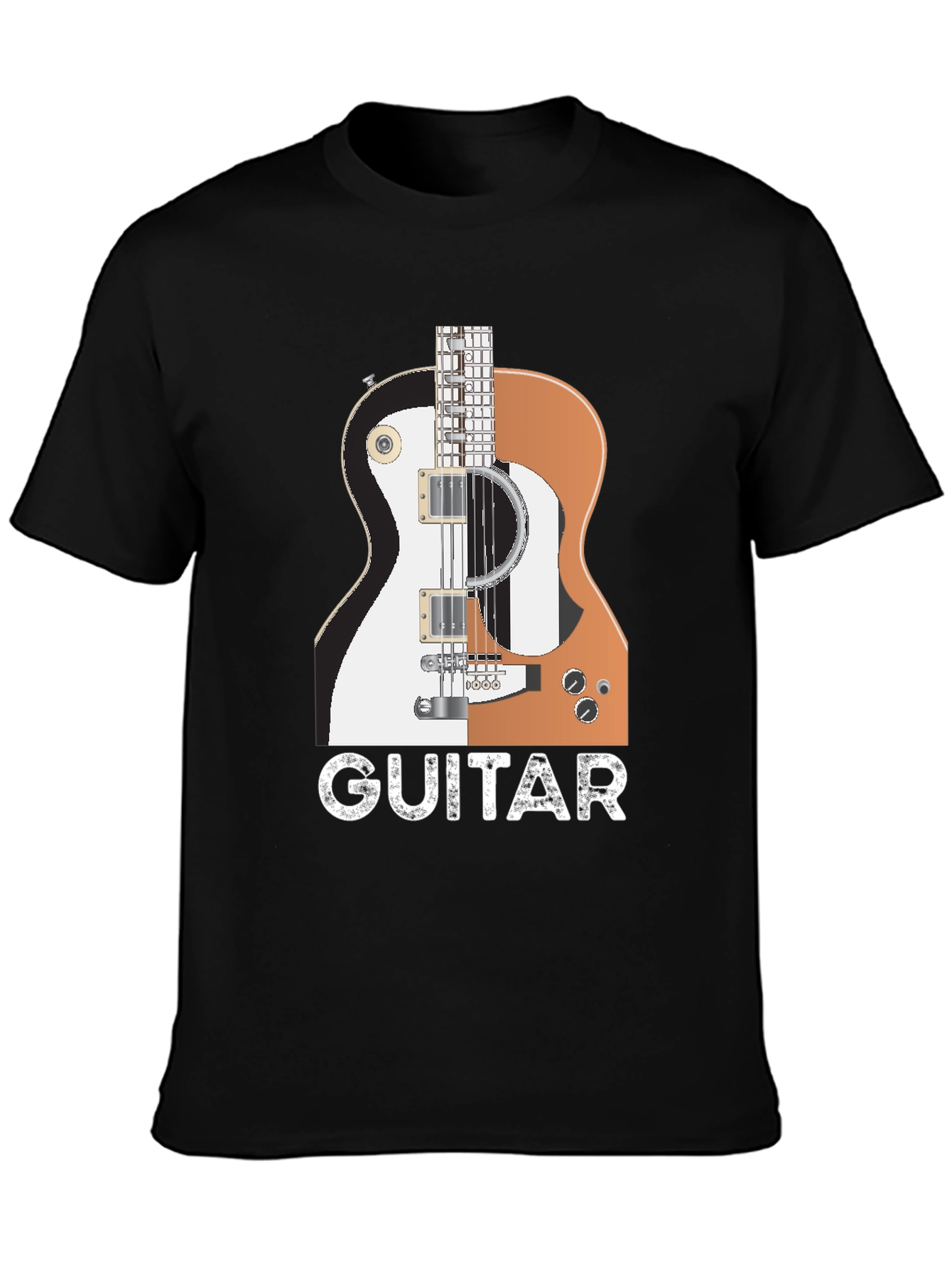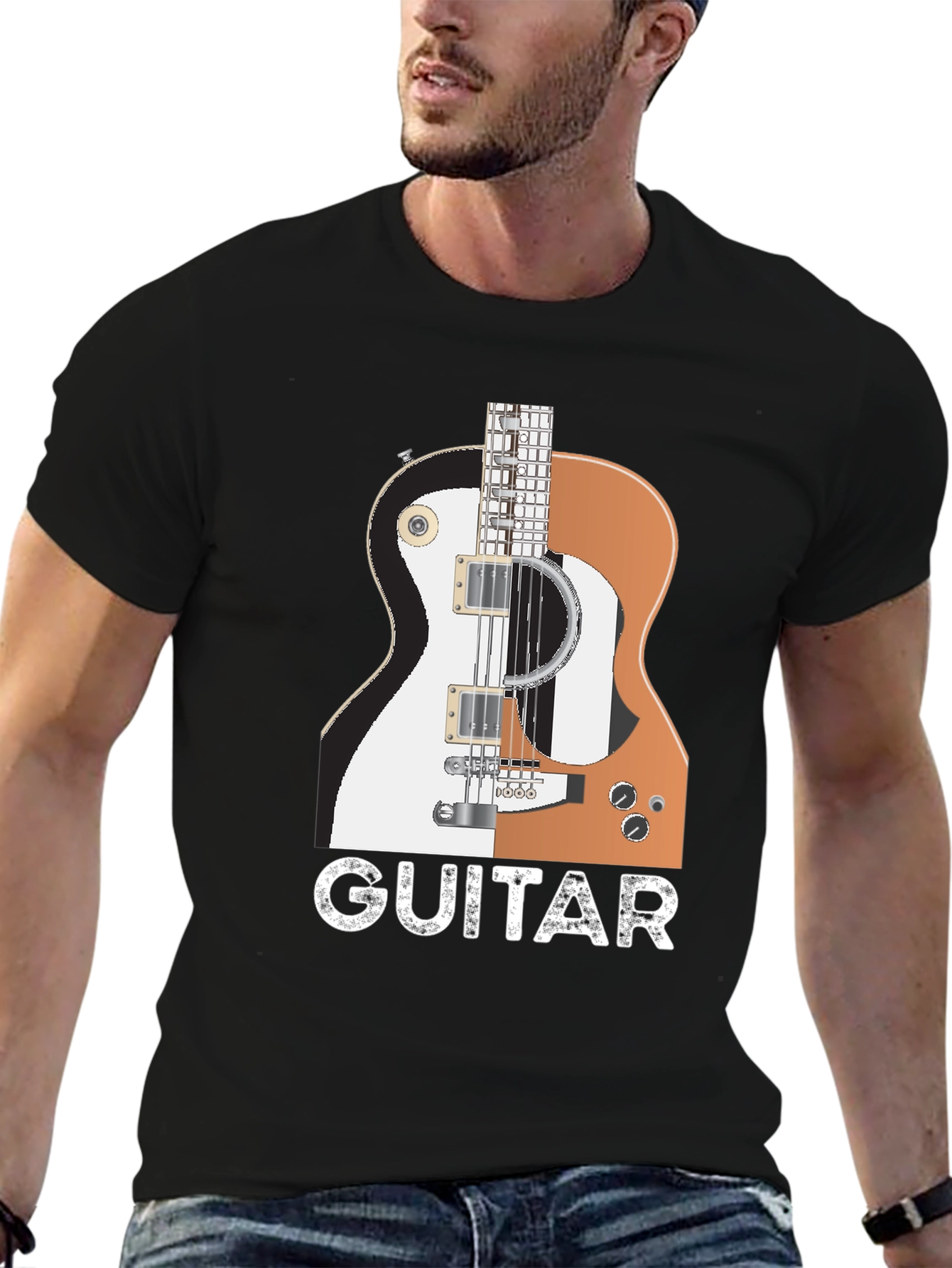 Rock your style with this unique guitar graphic t-shirt! Featuring a bold, half-and-half guitar design, this tee is perfect for music lovers and guitar enthusiasts. The design includes the word "GUITAR" in a stylish font. The shirt appears to be made of a comfortable, breathable fabric, ideal for everyday wear. Show off your passion for music with this eye-catching and stylish tee. A great conversation starter and a must-have for any musician's wardrobe. Perfect for concerts, band practice, or just hanging out.
