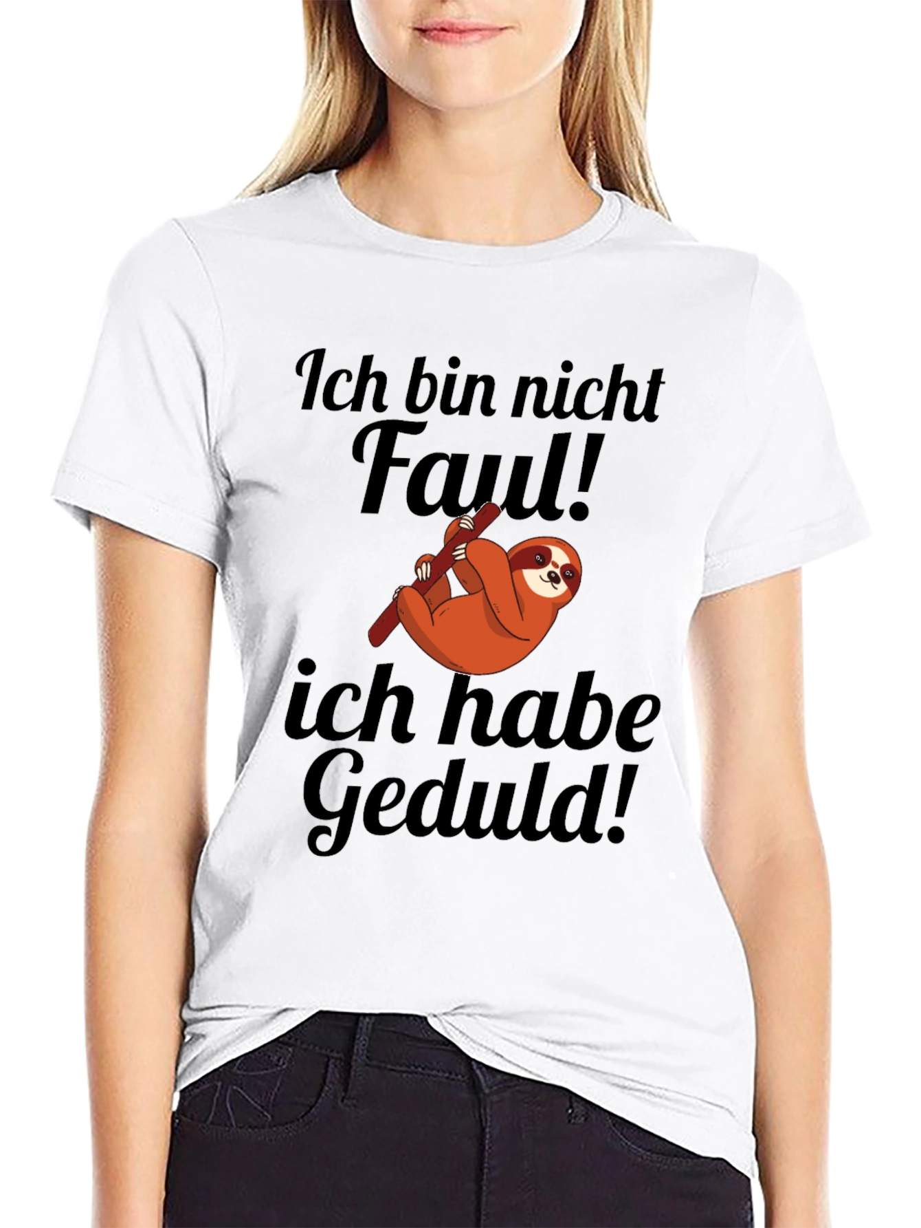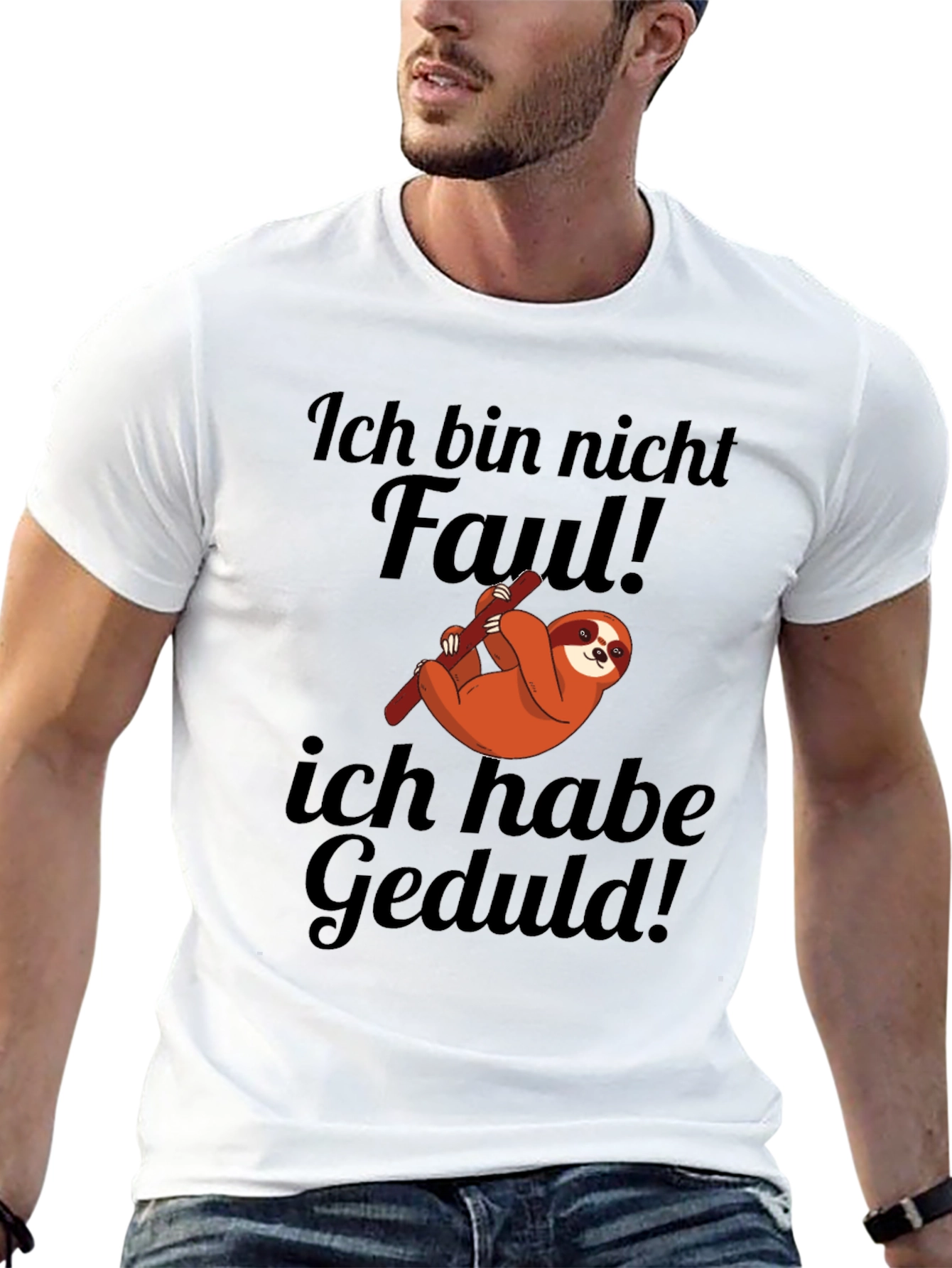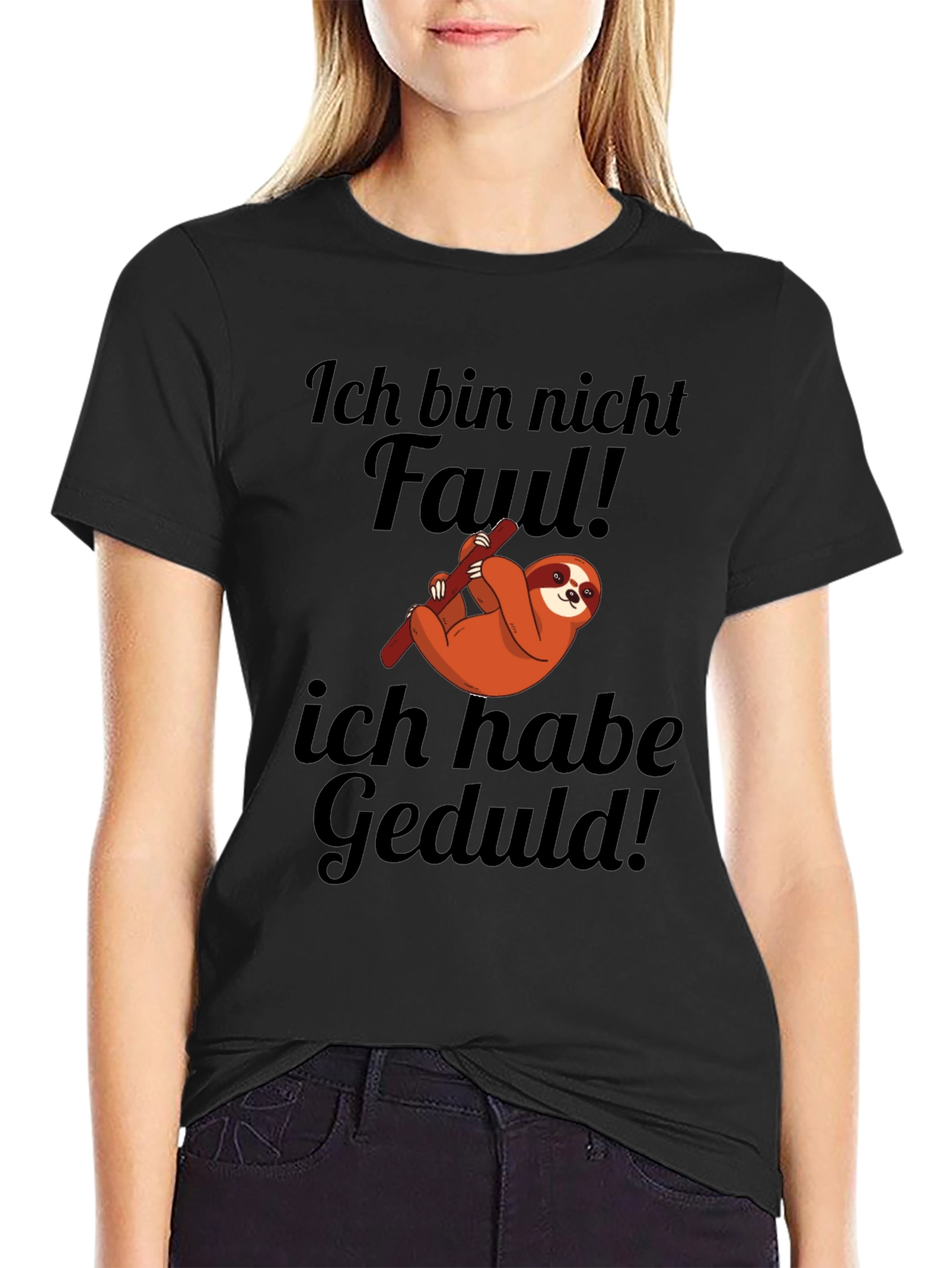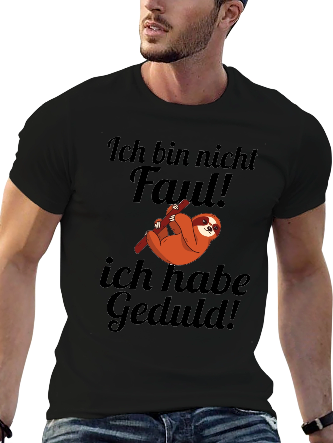 This stylish black t-shirt features a playful design with a cute sloth hanging from a branch. Above and below the sloth, the German text "Ich bin nicht Faul! ich habe Geduld!" is printed in a stylish font. The shirt appears to be made from a soft, comfortable material. Perfect for casual wear, it's a great conversation starter and a fun way to express your laid-back personality. Ideal for sloth lovers or anyone with a good sense of humor, this t-shirt is a unique addition to any wardrobe. The bold graphic print ensures it will stand out from the crowd. Get yours today and showcase your patient side!