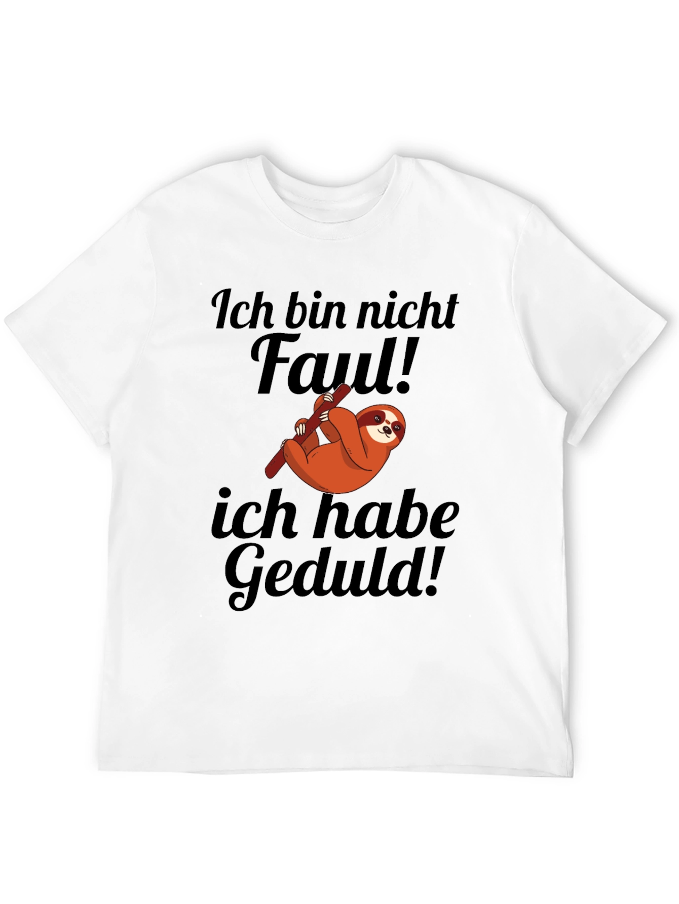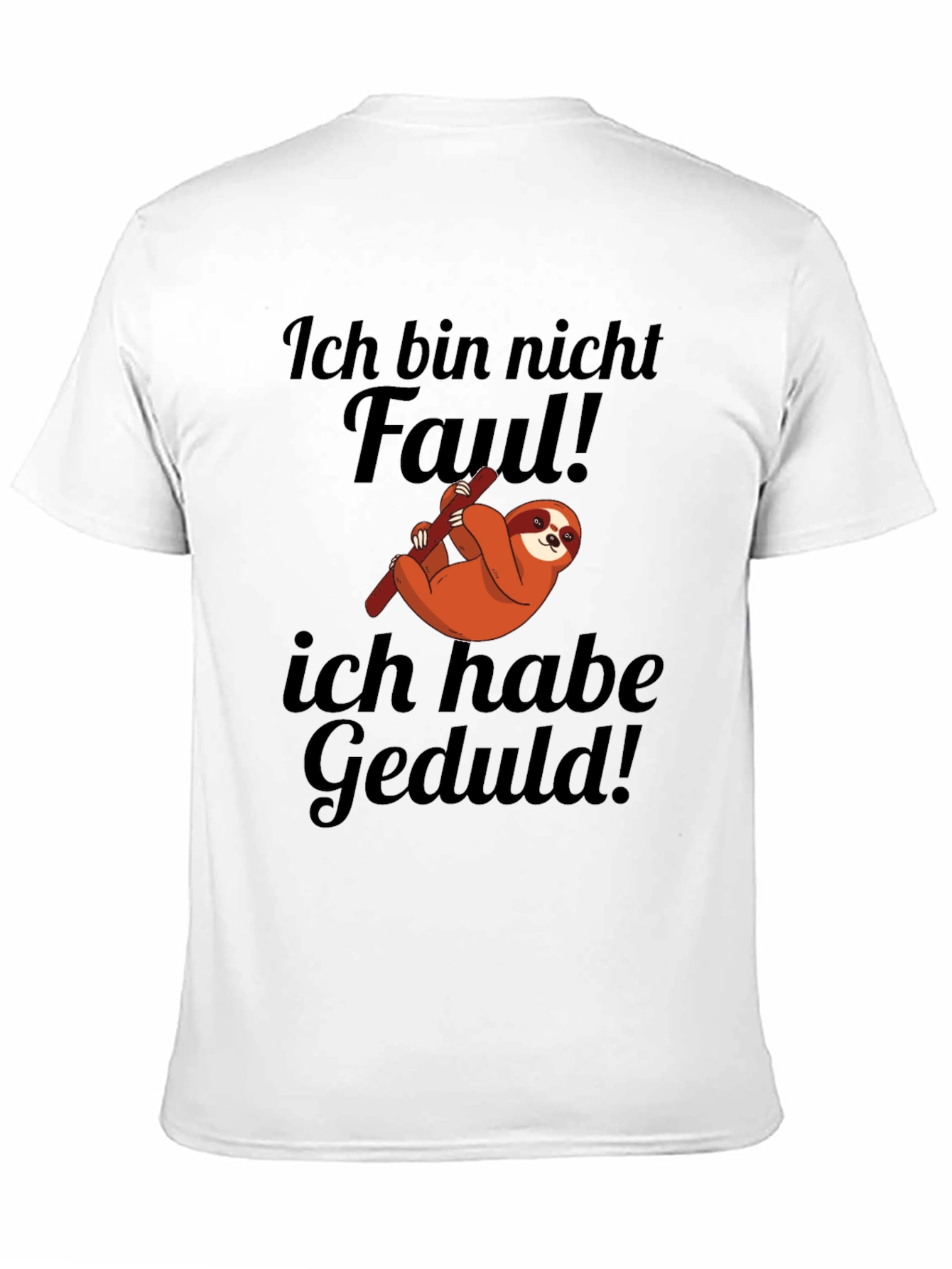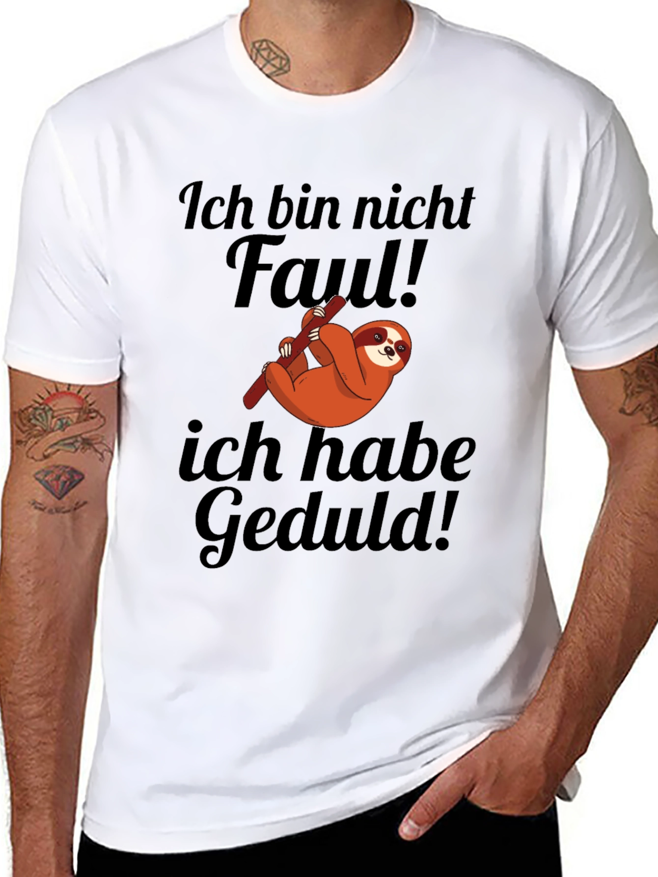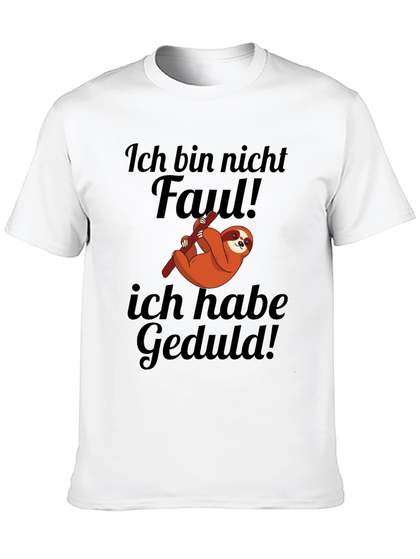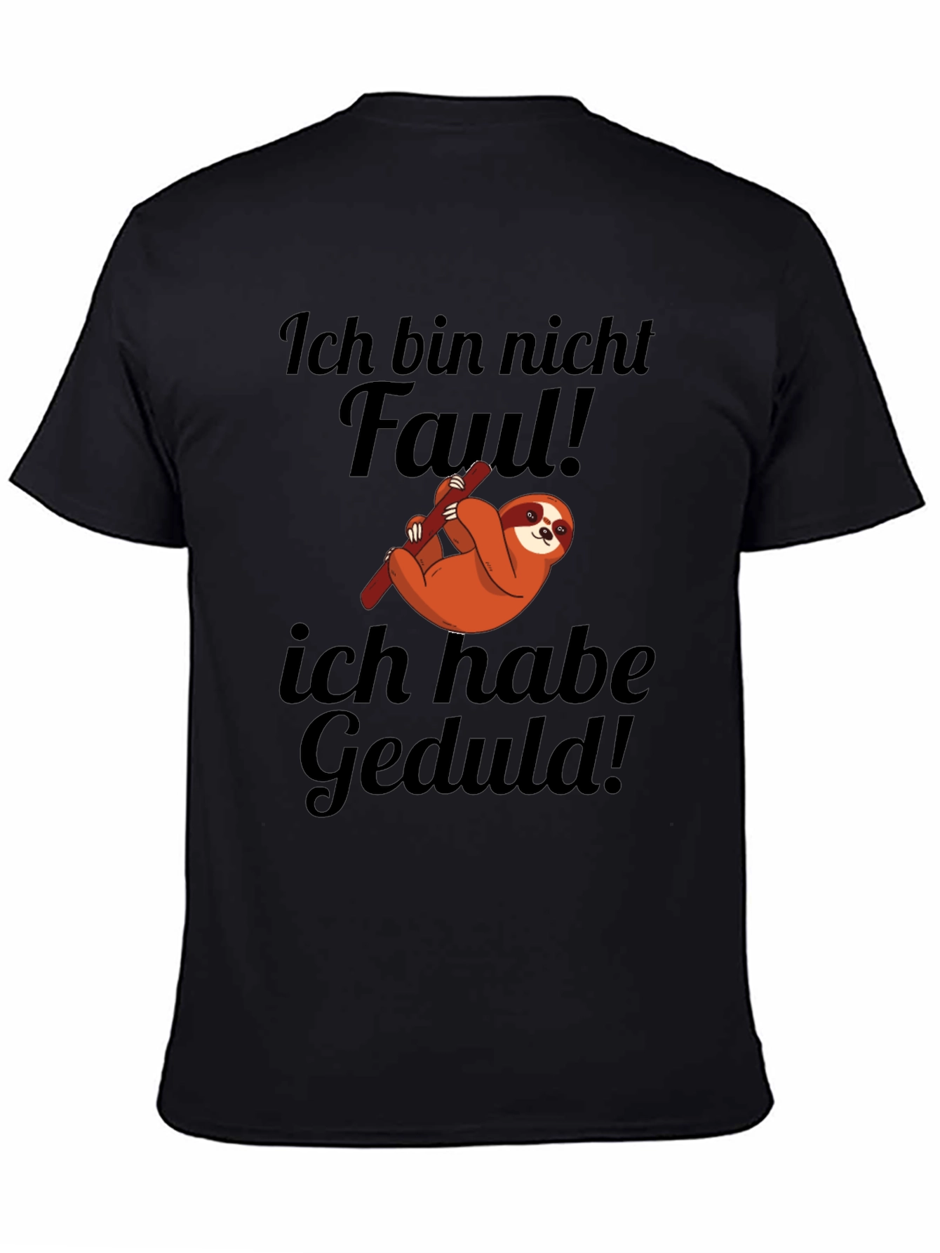 This stylish black t-shirt features a playful design with a cute sloth hanging from a branch. Above and below the sloth, the German text "Ich bin nicht Faul! ich habe Geduld!" is printed in a stylish font. The shirt appears to be made from a soft, comfortable material. Perfect for casual wear, it's a great conversation starter and a fun way to express your laid-back personality. Ideal for sloth lovers or anyone with a good sense of humor, this t-shirt is a unique addition to any wardrobe. The bold graphic print ensures it will stand out from the crowd. Get yours today and showcase your patient side!