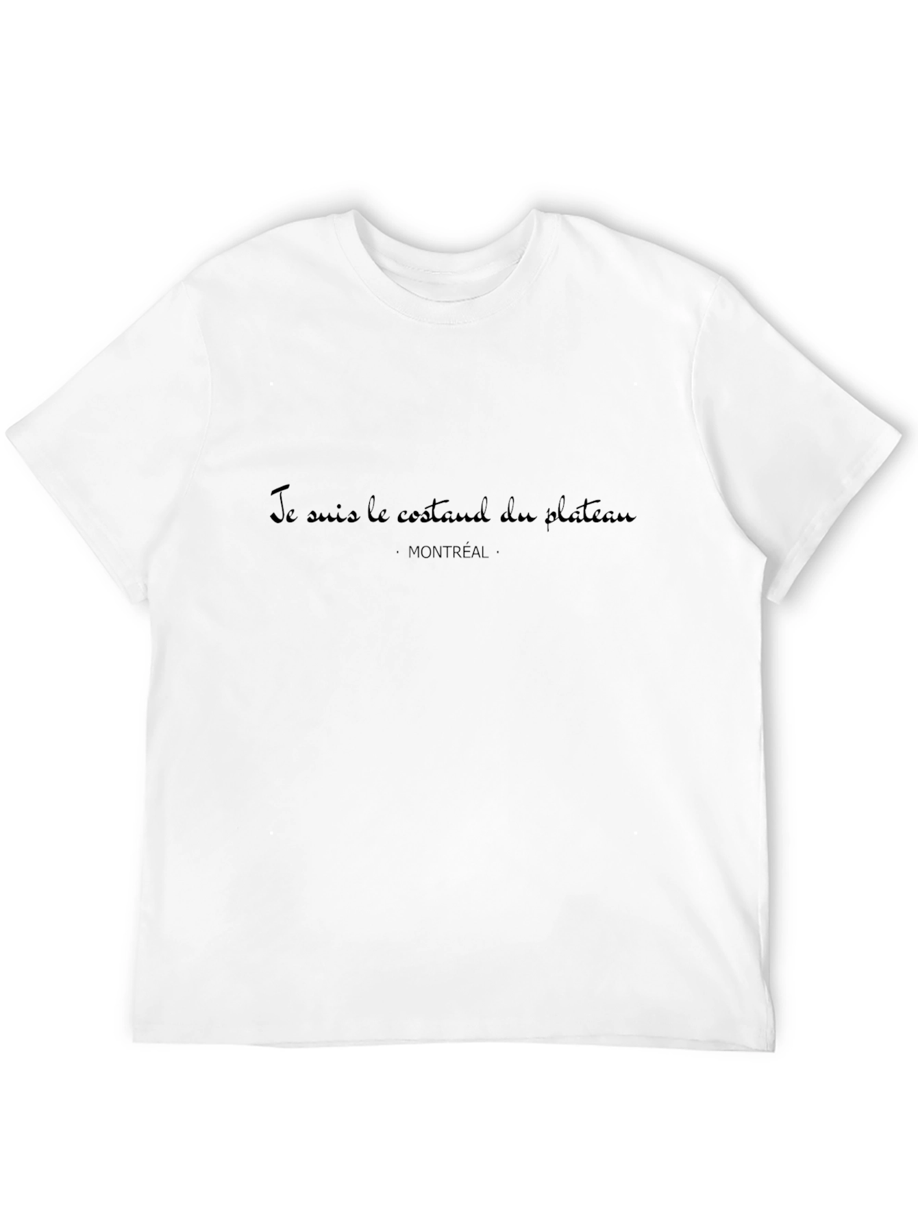 Show off your Montreal pride with this stylish black T-shirt. The shirt features the phrase 'Je suis le costaud du plateau' in an elegant script, making it a perfect conversation starter. Made from a comfortable, breathable fabric, this tee is ideal for casual wear, whether you're strolling through the Plateau neighborhood or just hanging out with friends. A unique and fashionable way to represent your love for Montreal. Get yours today and wear your city with pride!