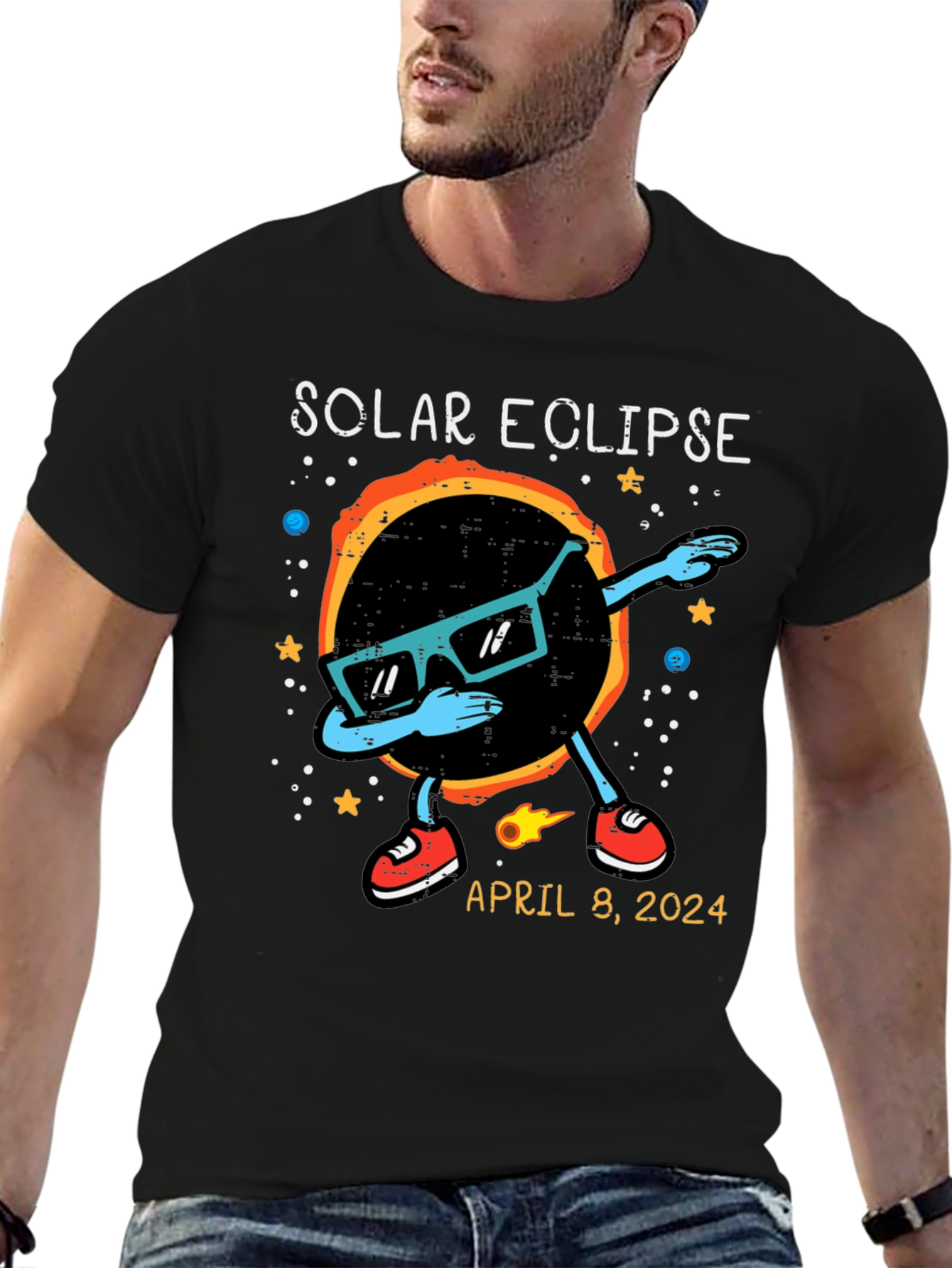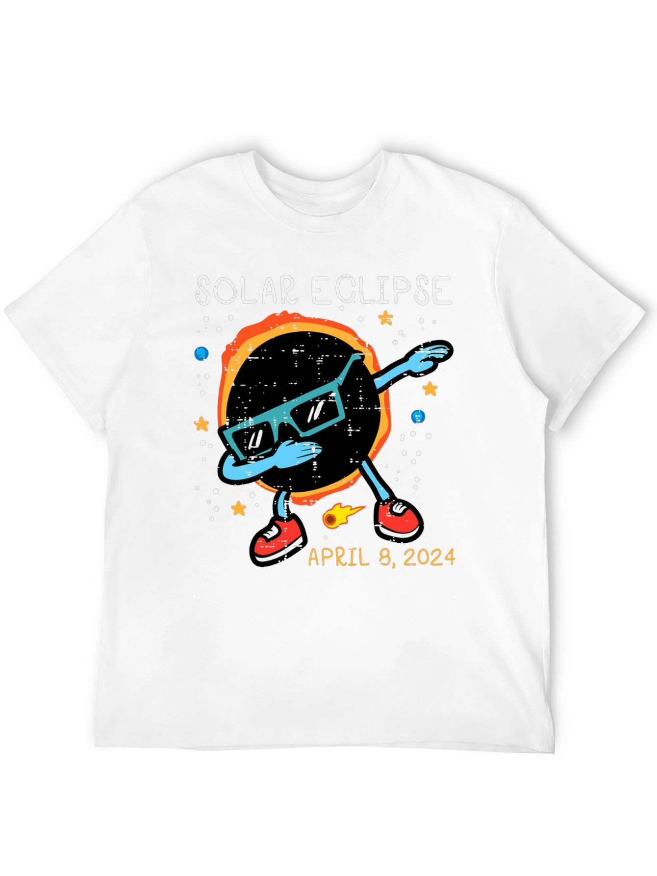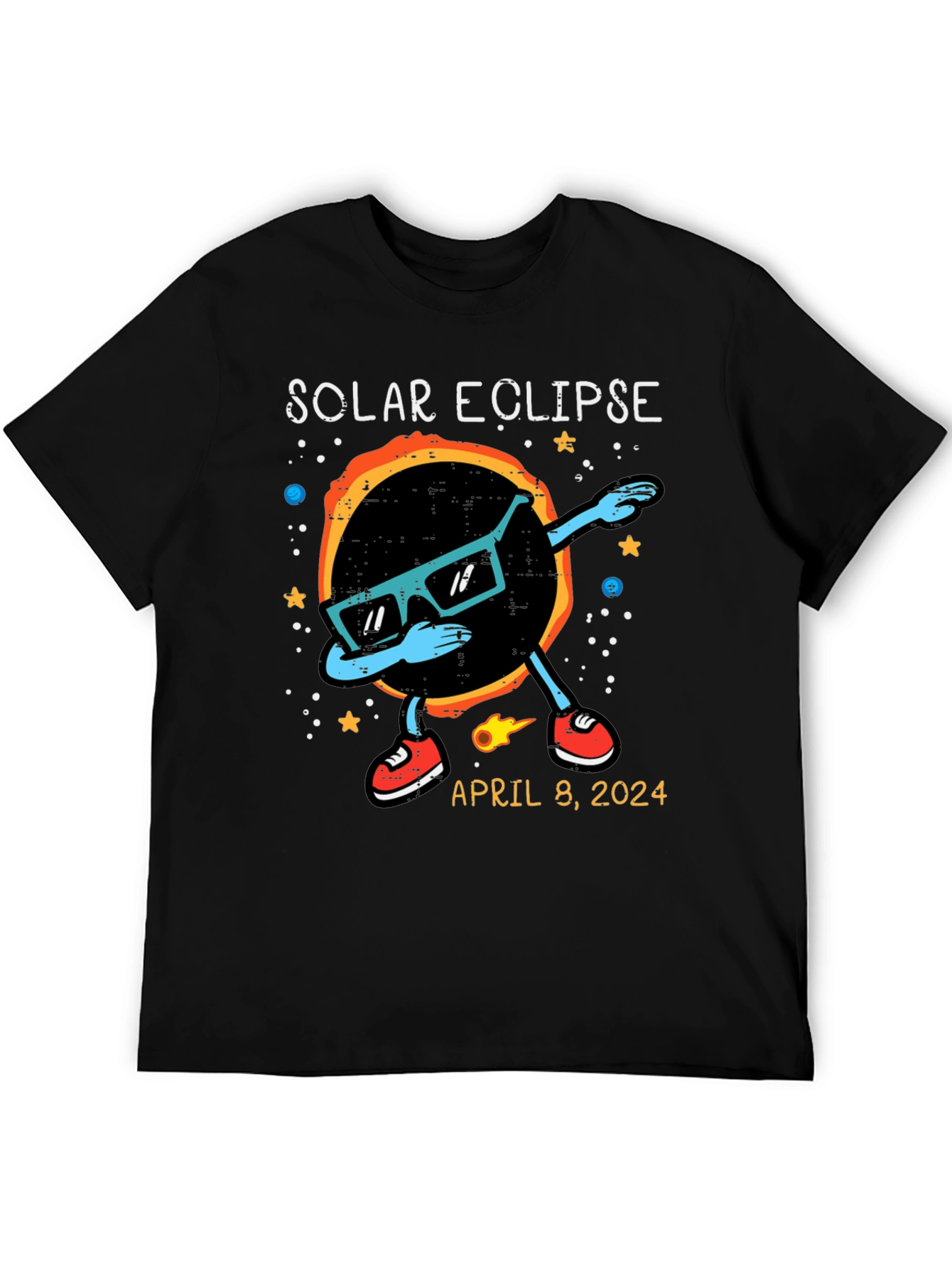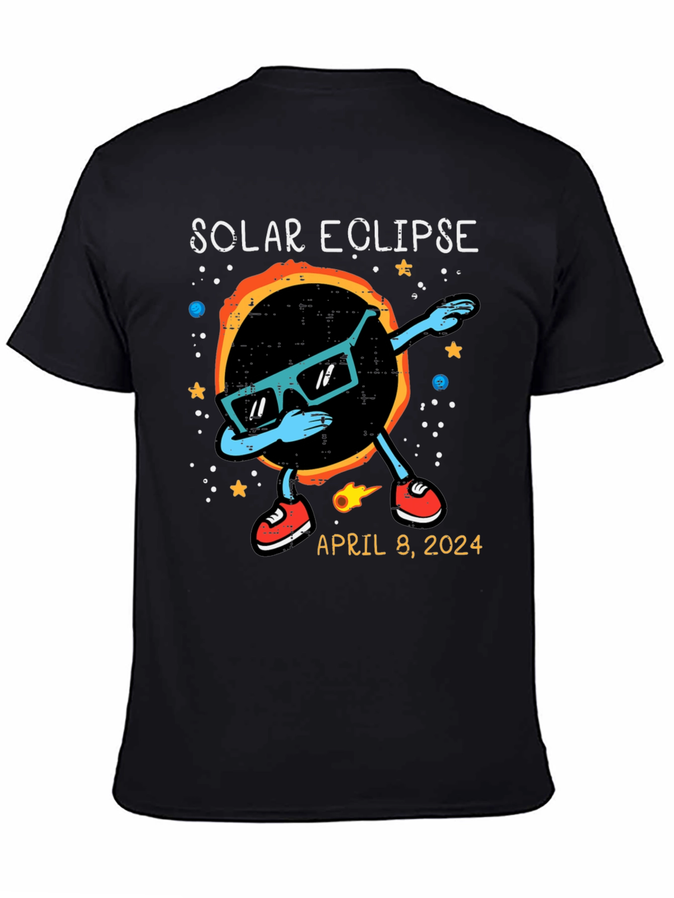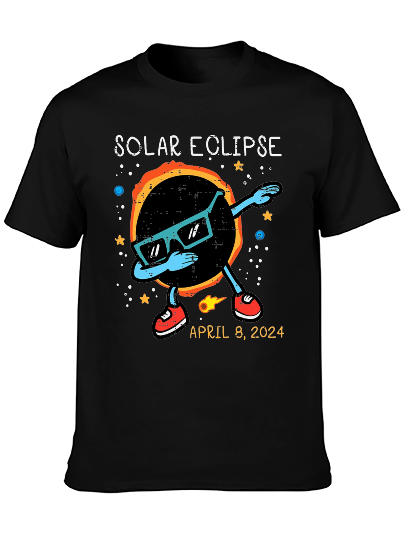 Witness the celestial event in style with this unique Solar Eclipse T-Shirt! The shirt features a cool graphic of the solar eclipse wearing sunglasses and dabbing. Stars and planets adorn the background. The shirt also includes the date of the anticipated event: April 8, 2024. Made from comfortable, breathable fabric, this t-shirt is perfect for eclipse viewing parties, science enthusiasts, or anyone who wants to commemorate this rare astronomical phenomenon. Get yours now and be ready to celebrate the solar eclipse in style!
