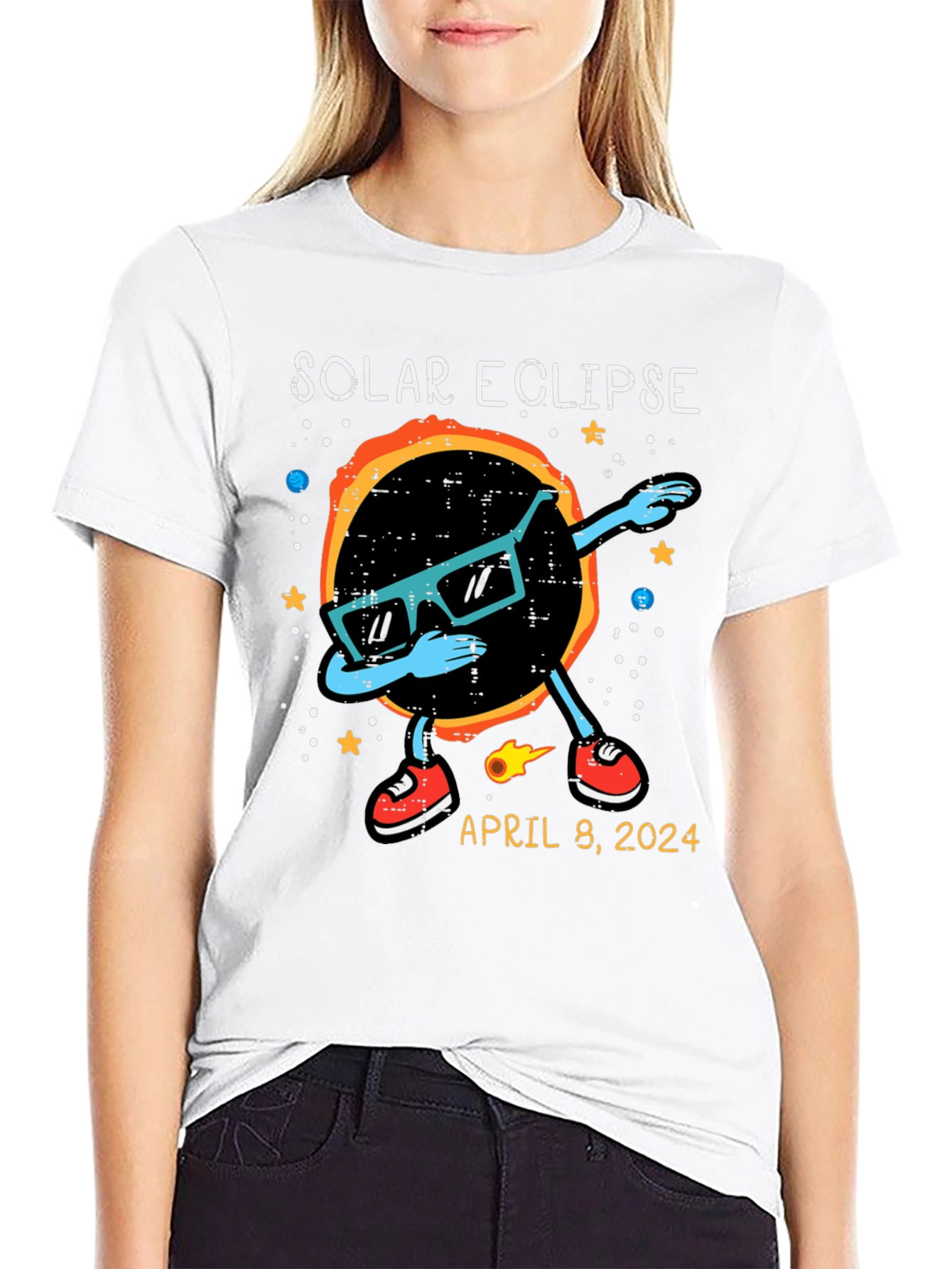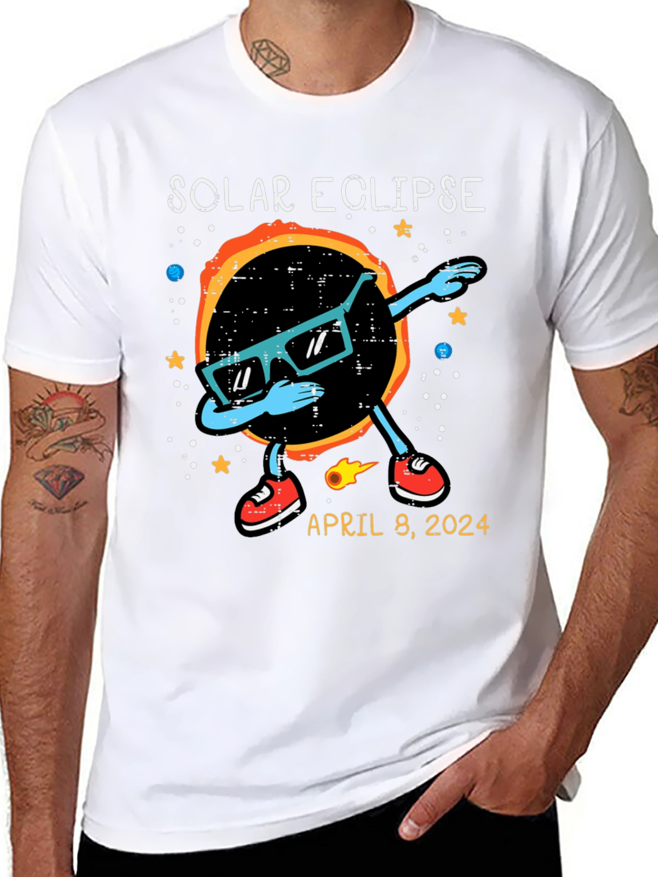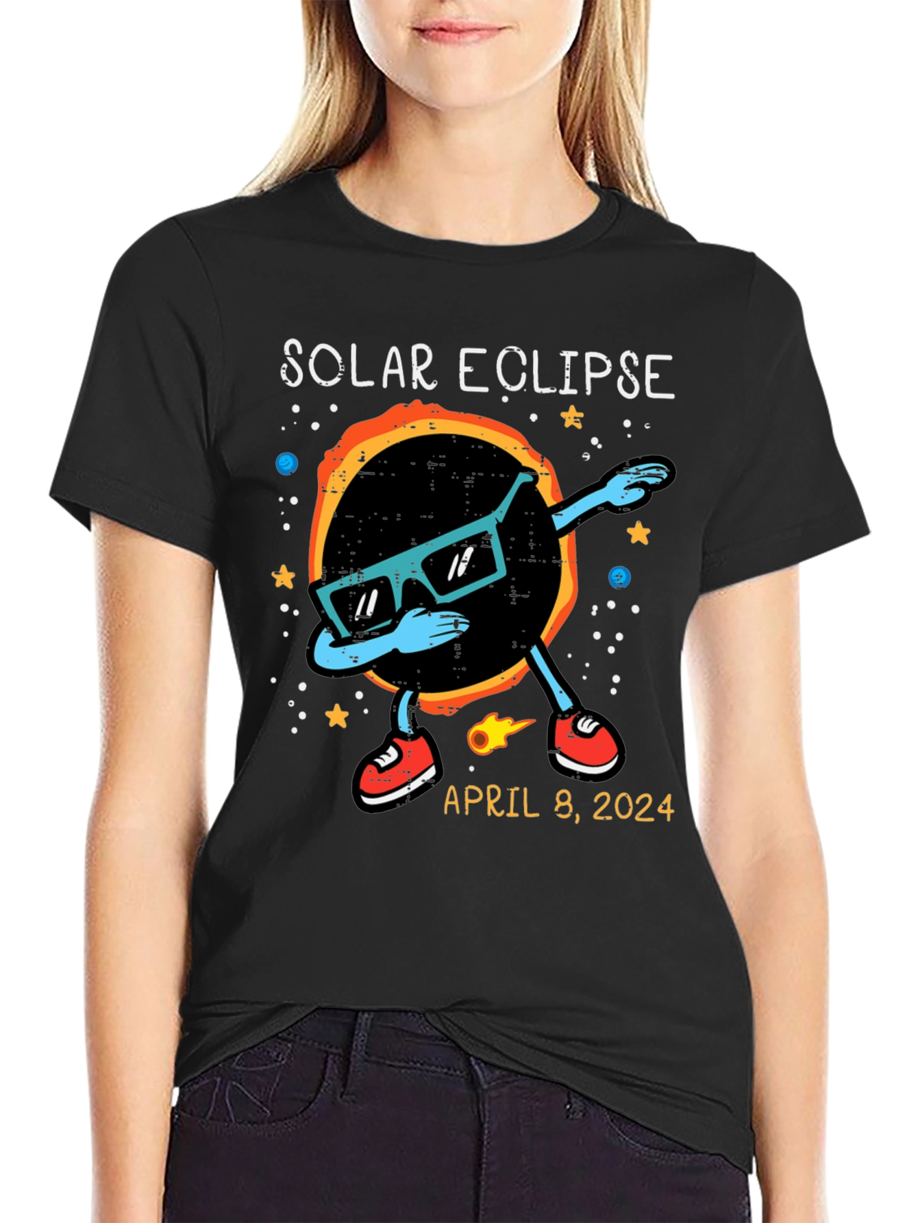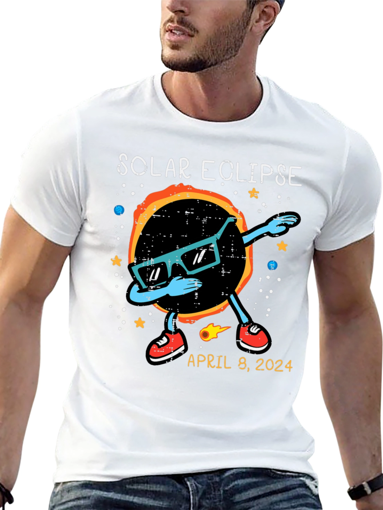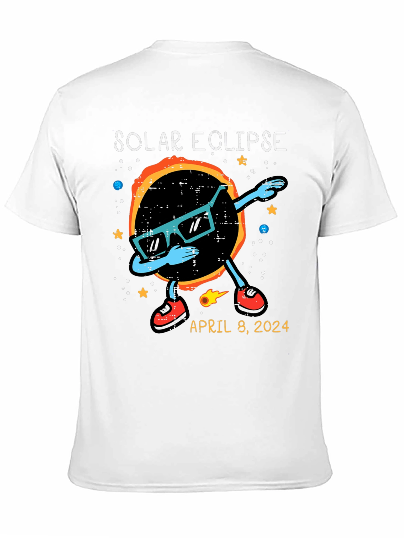 Witness the celestial event in style with this unique Solar Eclipse T-Shirt! The shirt features a cool graphic of the solar eclipse wearing sunglasses and dabbing. Stars and planets adorn the background. The shirt also includes the date of the anticipated event: April 8, 2024. Made from comfortable, breathable fabric, this t-shirt is perfect for eclipse viewing parties, science enthusiasts, or anyone who wants to commemorate this rare astronomical phenomenon. Get yours now and be ready to celebrate the solar eclipse in style!