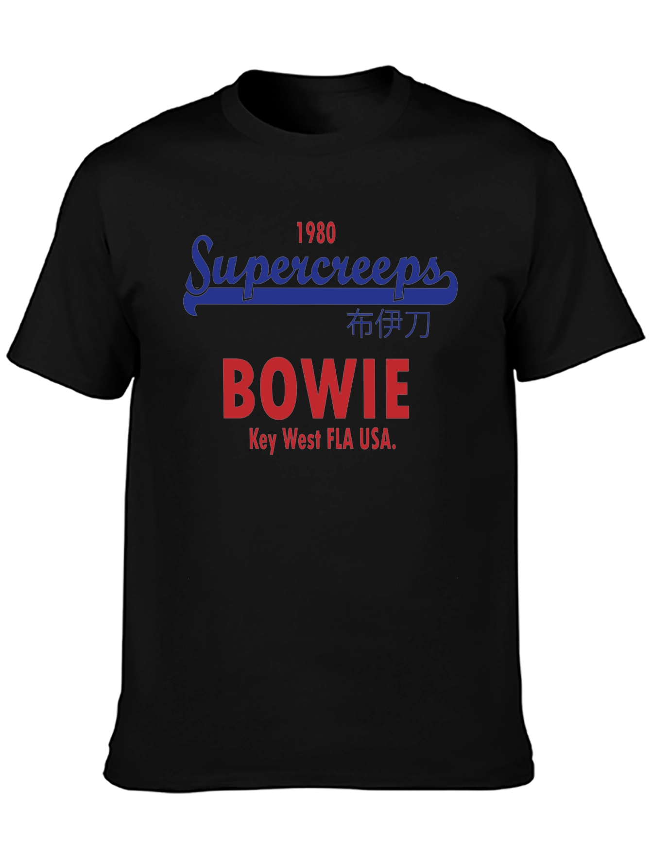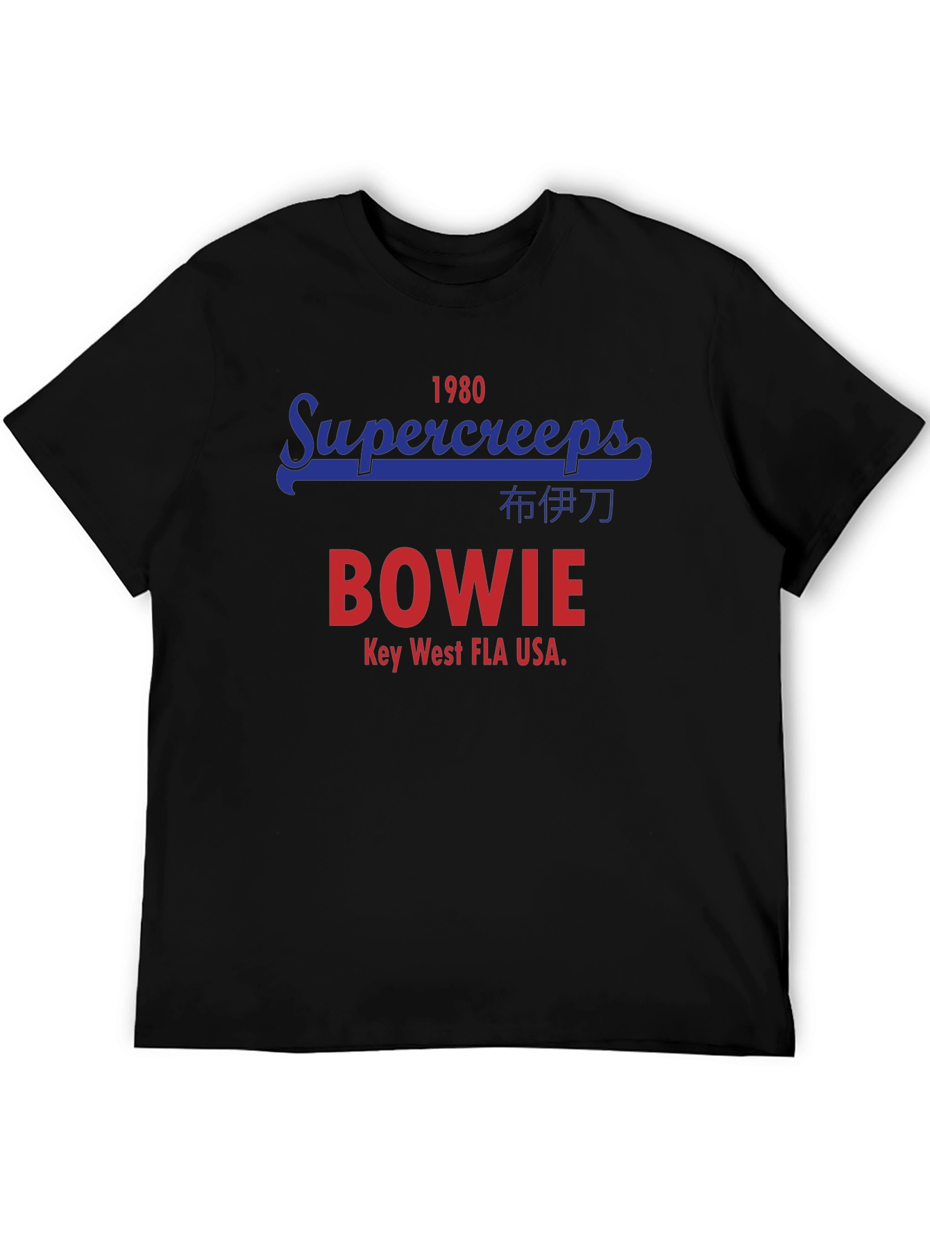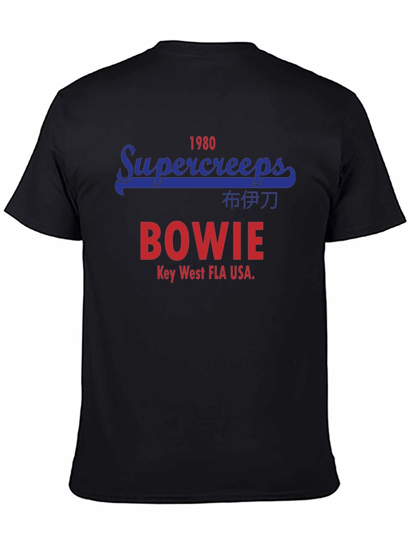 Rock a vintage vibe with this black t-shirt featuring a retro-inspired graphic design. The print includes "Supercreeps 1980" in a stylized font, along with the name "Bowie" in bold red letters, and the location "Key West FLA USA.". The design also incorporates some Japanese characters, adding an interesting international flair. This shirt is perfect for music lovers and fans of the era, and it's ideal for casual wear, concerts, or expressing your unique style. Soft, breathable, and stylish, this tee will become a wardrobe favorite.