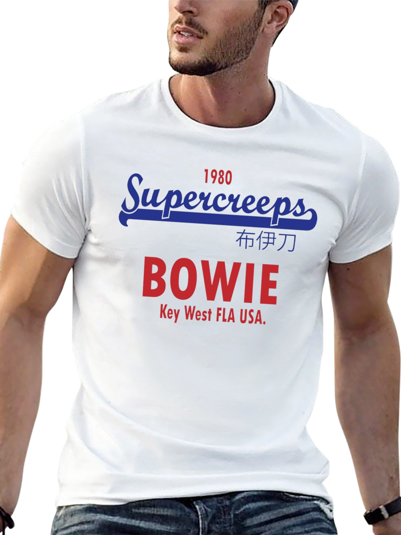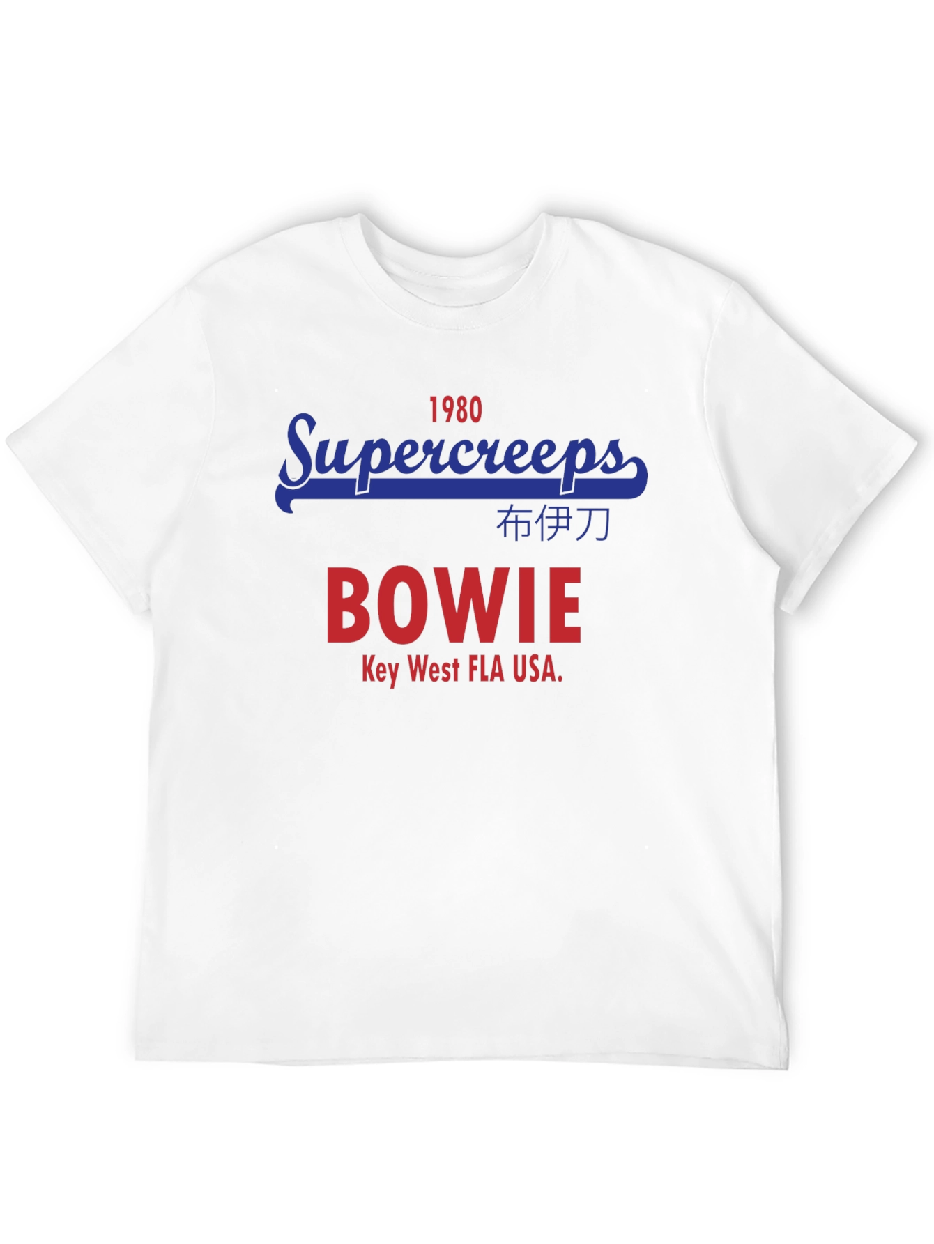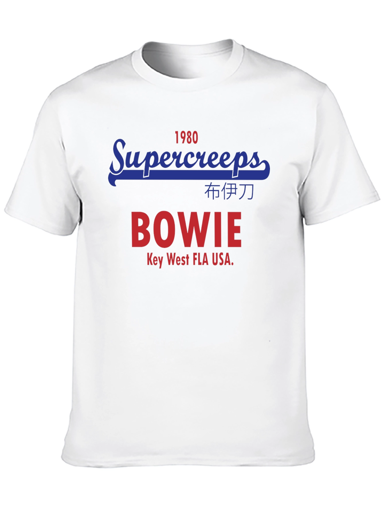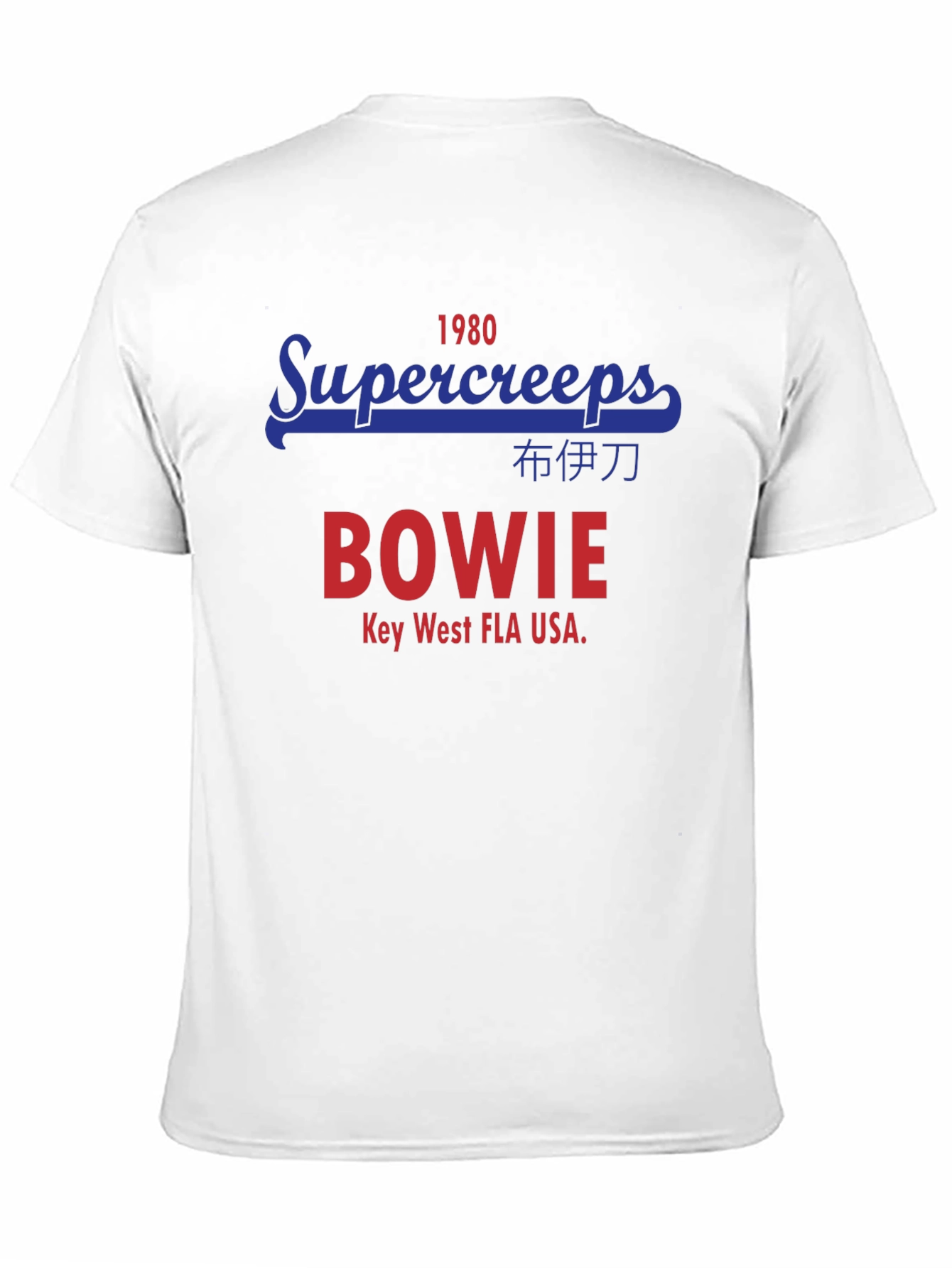 Rock a vintage vibe with this black t-shirt featuring a retro-inspired graphic design. The print includes "Supercreeps 1980" in a stylized font, along with the name "Bowie" in bold red letters, and the location "Key West FLA USA.". The design also incorporates some Japanese characters, adding an interesting international flair. This shirt is perfect for music lovers and fans of the era, and it's ideal for casual wear, concerts, or expressing your unique style. Soft, breathable, and stylish, this tee will become a wardrobe favorite.