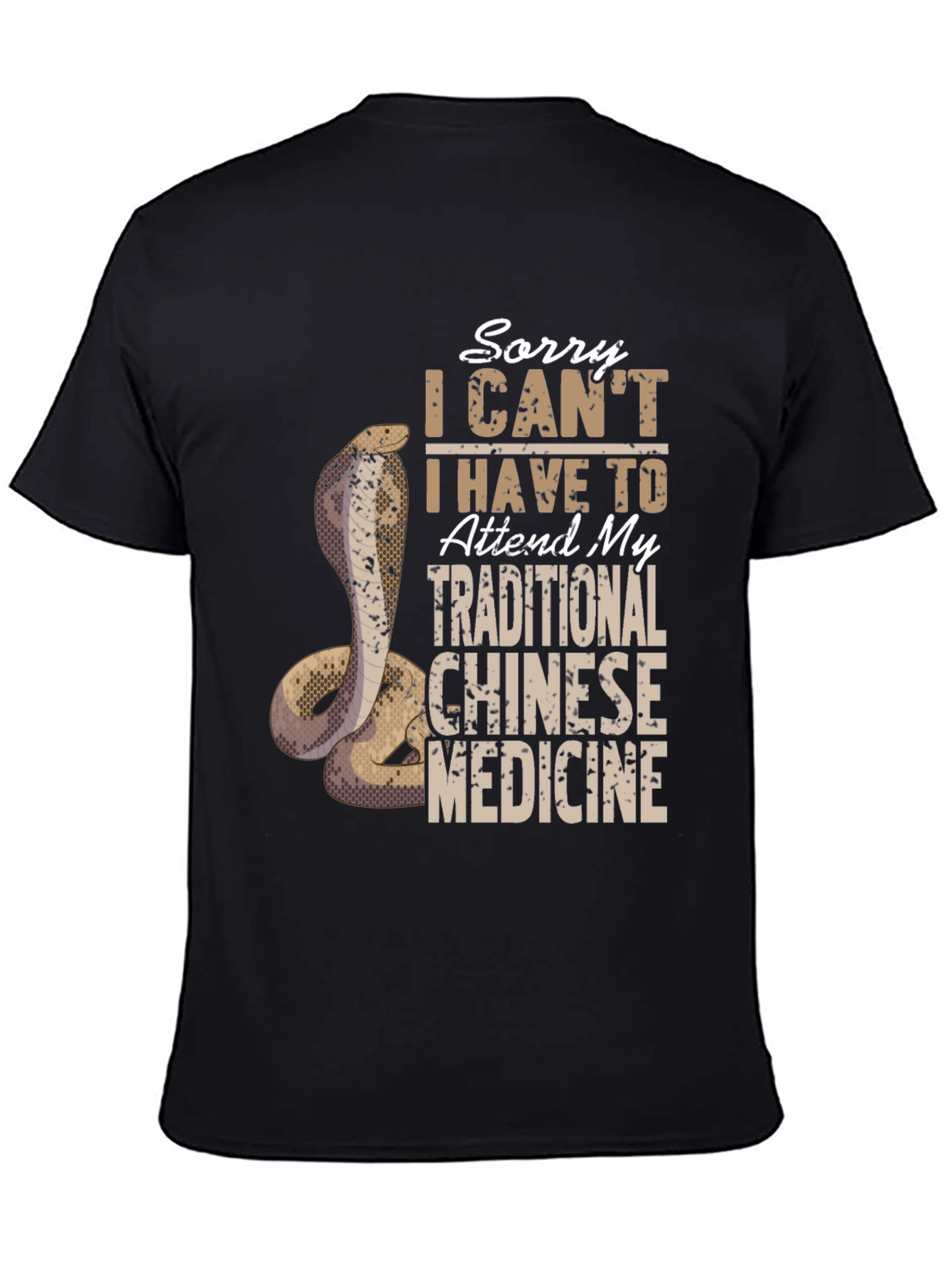 This black t-shirt features a striking design. A coiled cobra is prominently displayed beside the phrase "Sorry I CAN'T I HAVE TO Attend My TRADITIONAL CHINESE MEDICINE" in an appealing layered font. This eye-catching tee makes a statement and could be worn for everyday wear, or as a conversation starter about alternative medicine. The shirt appears to be made of a comfortable, soft material. A perfect blend of style and personality for those with a unique sense of humor.