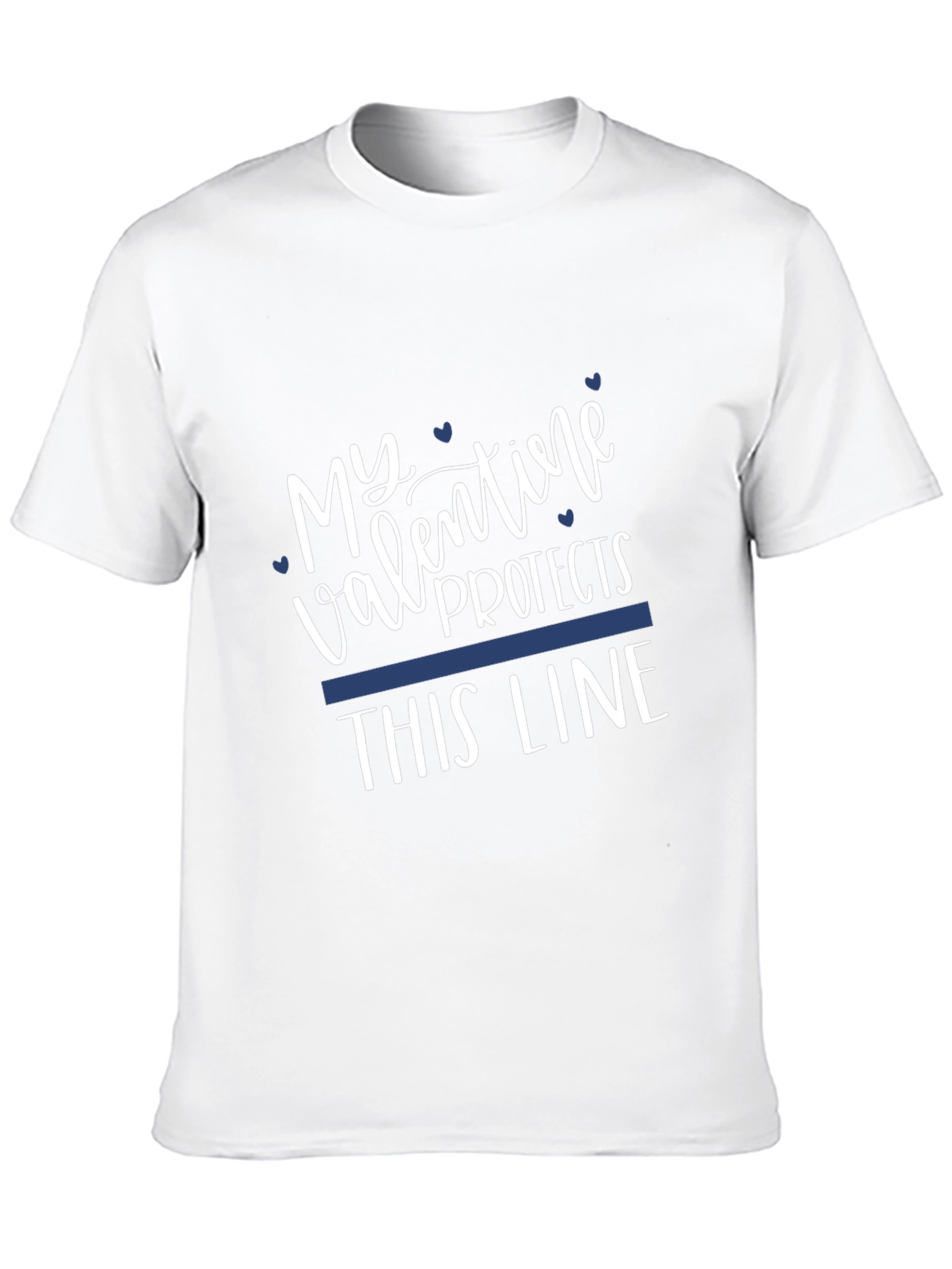 Show your love and support with this unique t-shirt! This classic black tee features a bold, eye-catching design that reads "My Valentine Protects This Line" in crisp white lettering, accented with small blue hearts and a blue line. The message is a thoughtful way to honor a loved one in law enforcement or any protective service. Made from a soft, comfortable fabric, this t-shirt is perfect for everyday wear or as a special gift for Valentine's Day, anniversaries, or any occasion to show your appreciation. It's a stylish way to make a statement and express your pride and admiration.